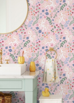 Pretty in pink and full of pony magic this My Little Pony peel and stick wallpaper adds a girly and whimsical touch to your walls. Beloved retro ponies Glory, Snuzzle, Starshine and Blossom prance among colorful flowers, hearts and botanicals all set against a pink background, creating a joyful scene that sparks imagination. My Little Pony Retro Floral Pink Peel and Stick Wallpaper comes on one roll that measures 20.5 inches wide by 18 feet long.
