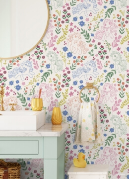 Perfect for little dreamers, this whimsical My Little Pony peel and stick wallpaper brings magic to any space. Featuring their favorite retro ponies Glory, Snuzzle, Starshine and Blossom surrounded by colorful botanicals, hearts, and flowers on top of a beige background, this peel and stick wallpaper transforms walls into an enchanted world full of imagination. My Little Pony Retro Floral Cream Peel and Stick Wallpaper comes on one roll that measures 20.5 inches wide by 18 feet long.