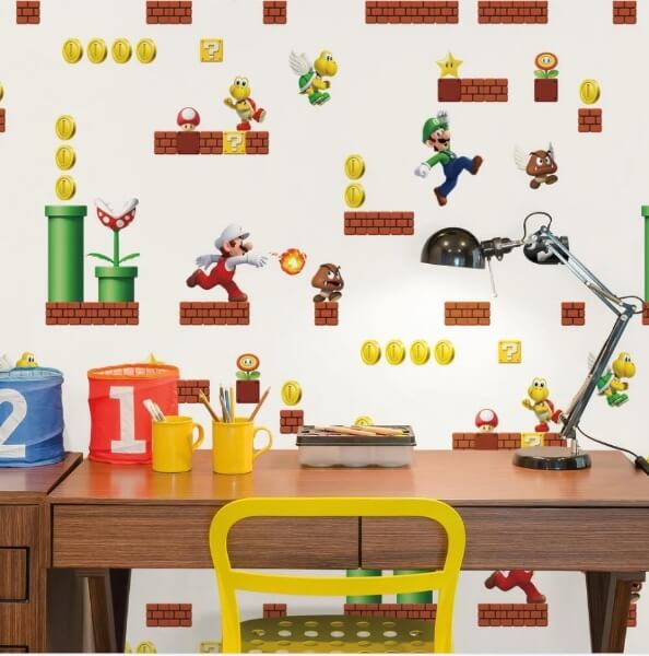 Transform your space into a royal kingdom with this Princess Peach™ peel and stick wallpaper! Featuring the iconic princess alongside green mushrooms, fire flowers, and stars, over a pink backdrop, this whimsical design will have your room blooming with beauty. With effortless application and removal, you can power up your room in no time, perfect for anyone looking to add a little Peach power to their walls! Super Mario Princess Peach Yellow and Pink Peel and Stick Wallpaper comes on one roll that measures 20.5 inches wide by 18 feet long.