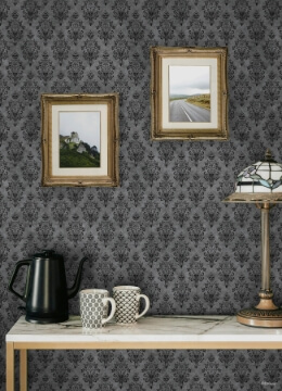 Transform your living space into an eerily elegant retreat with this officially-licensed Disney Haunted Mansion Damask peel and stick wallpaper. Perfect for those who appreciate the charm of vintage horror and the sophistication of traditional damask patterns, this distressed grey and black pattern brings the hauntingly beautiful ambience of the mansion to your space in just Peel, Stick…Done!® Disney Haunted Mansion Grey Peel and Stick Wallpaper comes on one roll that measures 20.5 inches wide by 18 feet long.