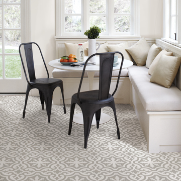 Give your floors an elevated look with this refined medallion design. Complete with white, grey, and steel blue hues, these floor tiles have a clean and polished look. Morris Peel and Stick Floor Tiles contains 10 pieces on 10 sheets that measure 12 x 12 inches. This product measures 60-in x 24-in when assembled.
