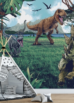 Featuring a T. Rex, Velociraptor, and a Stegosaurus, this wallpaper mural is the perfect way to display your love for Jurassic Park in any space. This mural comes on 7 panels on 7 sheets that come together to form the entire mural. Installation is as simple as Peel, Stick...Done!® Jurassic Park Peel and Stick Mural Peel and Stick Mural contains 7 pieces on 7 sheets that measure 84 inches x 18 inches.