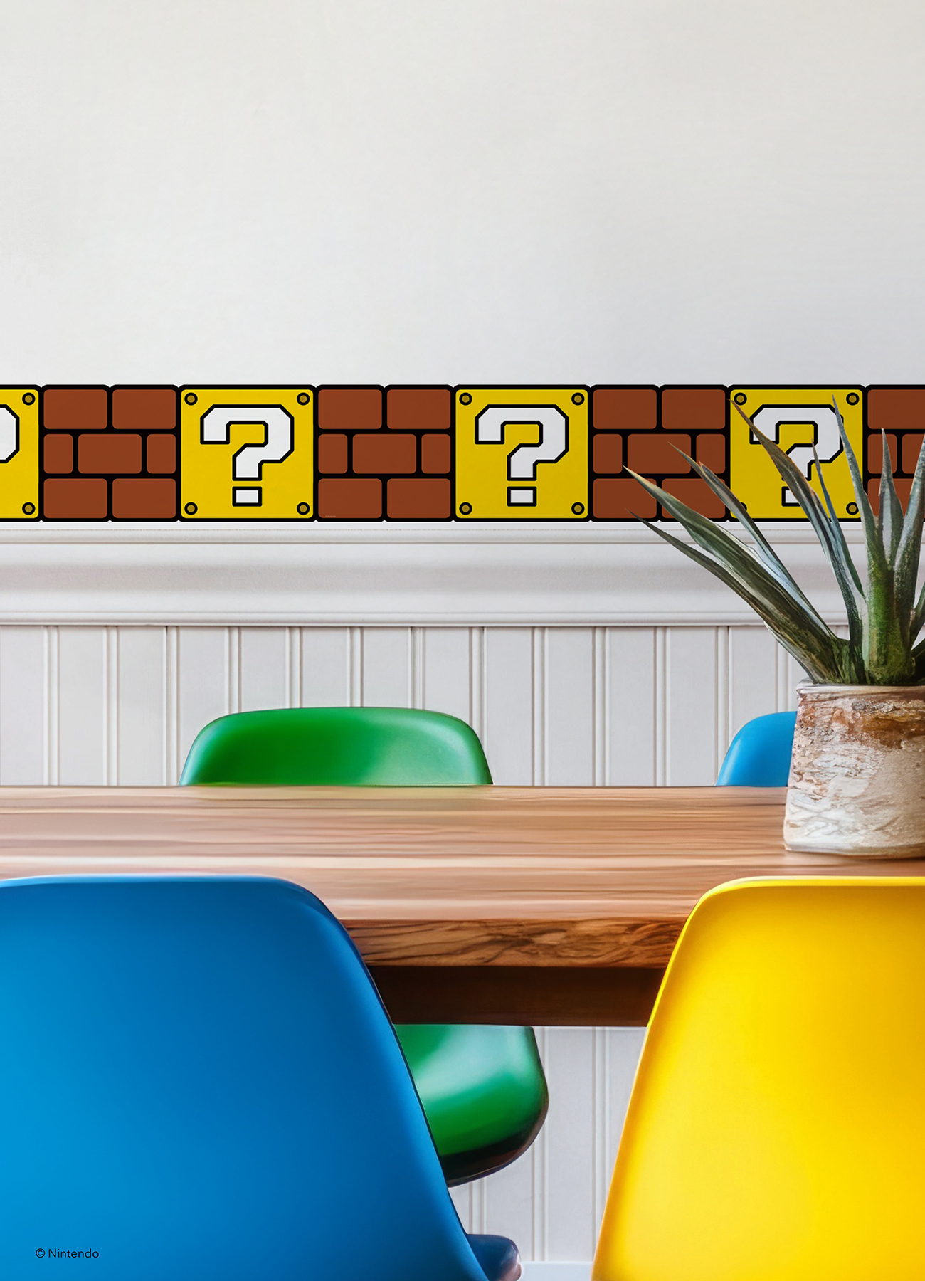 This easy peel and stick border delivers a fun, throwback look in seconds. Nintendo Super Mario Question Block Peel and Stick Border contains 1 piece on 1 sheet that measures 180-in x 6-in.