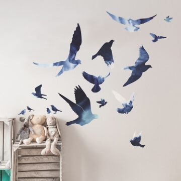 These removable wall decals depict birds in motion in shades varying from white to the deepest indigo blue. Use in a collection for an exceptional focal point or spread out randomly throughout the room.