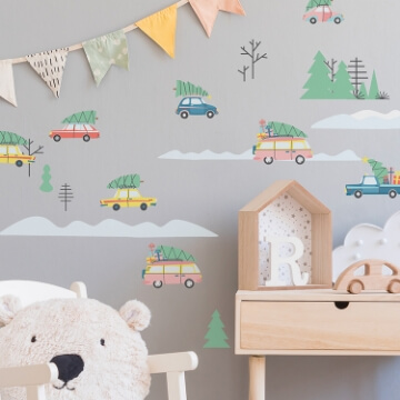 Let the soft sounds of holiday nostalgia fill your home while you decorate with the Retro Christmas Cars Peel and Stick Wall Decals from RoomMates.