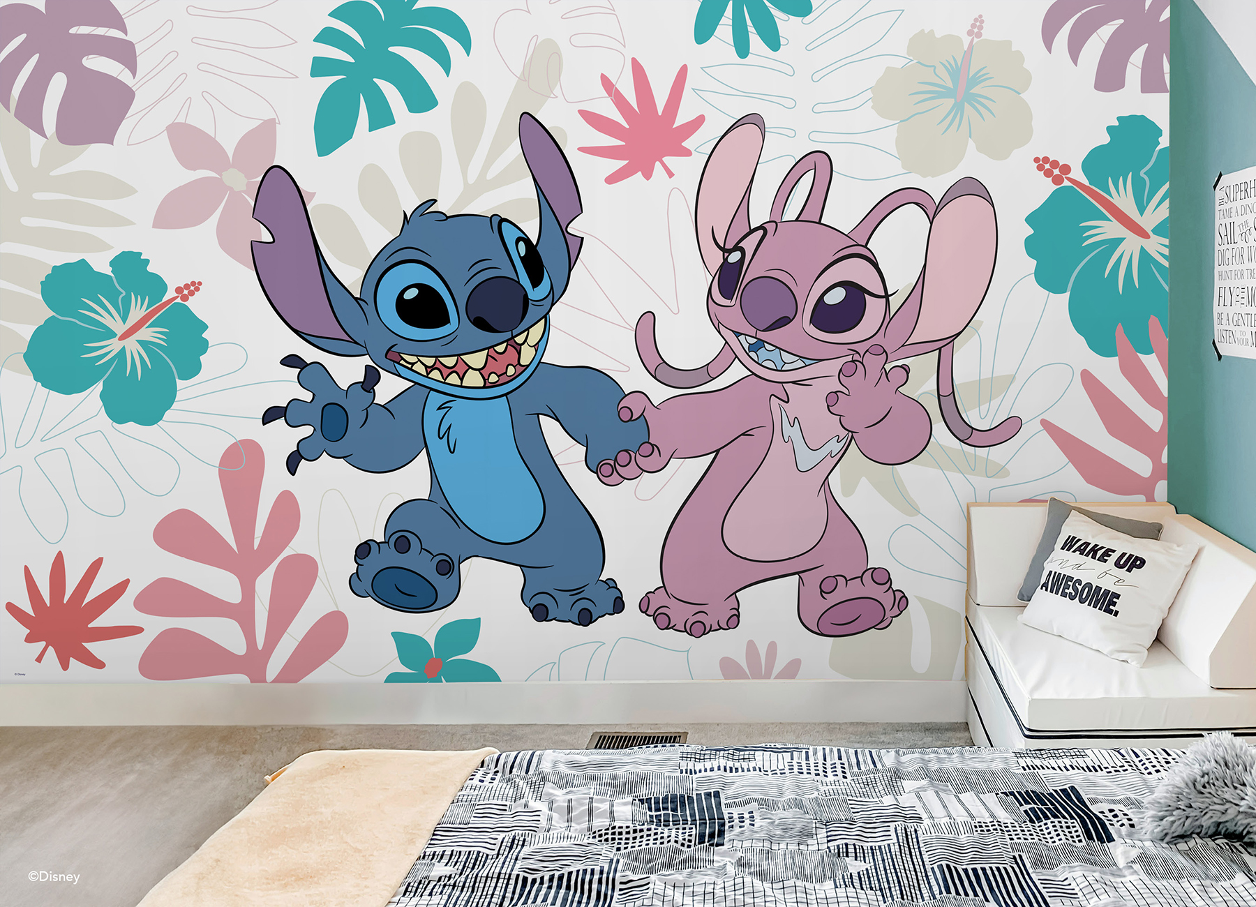 Featuring Stitch and Angel sharing a moment among vibrant florals and tropical accents, this playful design captures the charm, energy, and mischief of everyone’s favorite galactic duo. Stitch and Angel Peel and Stick Mural contains 7 panels that each measure 18 x 72 inches.