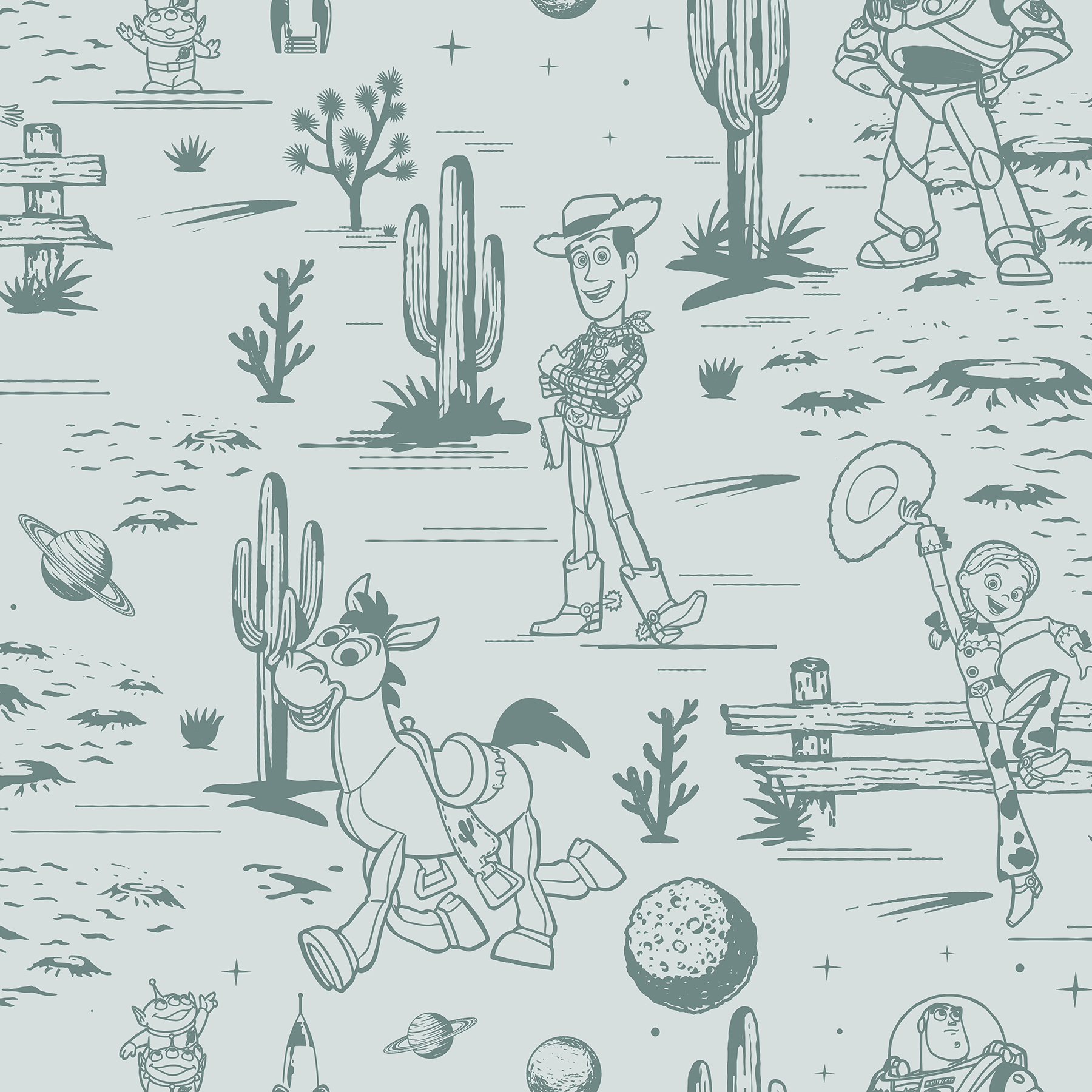 You could earn 25 reward points this purchase. Sign up. This Western-inspired toile brings the world of Toy Story to life through soft desert scenes and subtle character illustrations. Gentle linework and calm colorways create a playful yet refined pattern that adds charm to any space. Disney Toy Story Toile Teal Peel and Stick Wallpaper comes on one roll that measures 20.5 inches wide by 18 feet long.