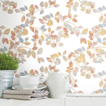 Gently vining leaves meander in graceful form and soft watercolor rendering in this Dancing Leaves peel and stick wallpaper from RoomMates.