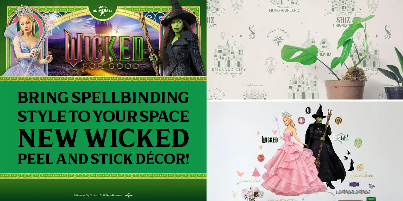 Invite the ornate beauty of Emerald City into your space with this Wicked peel and stick wallpaper print. Featuring the skyline of Emerald City in a luxurious green and gold palette, this Art Deco-inspired fan print brings the magic of the film to your space. No spells needed for installation; get the look in just Peel, Stick…Done!® Wicked Emerald City Peel and Stick Wallpaper comes on one roll that measures 20.5 inches wide by 18 feet long.