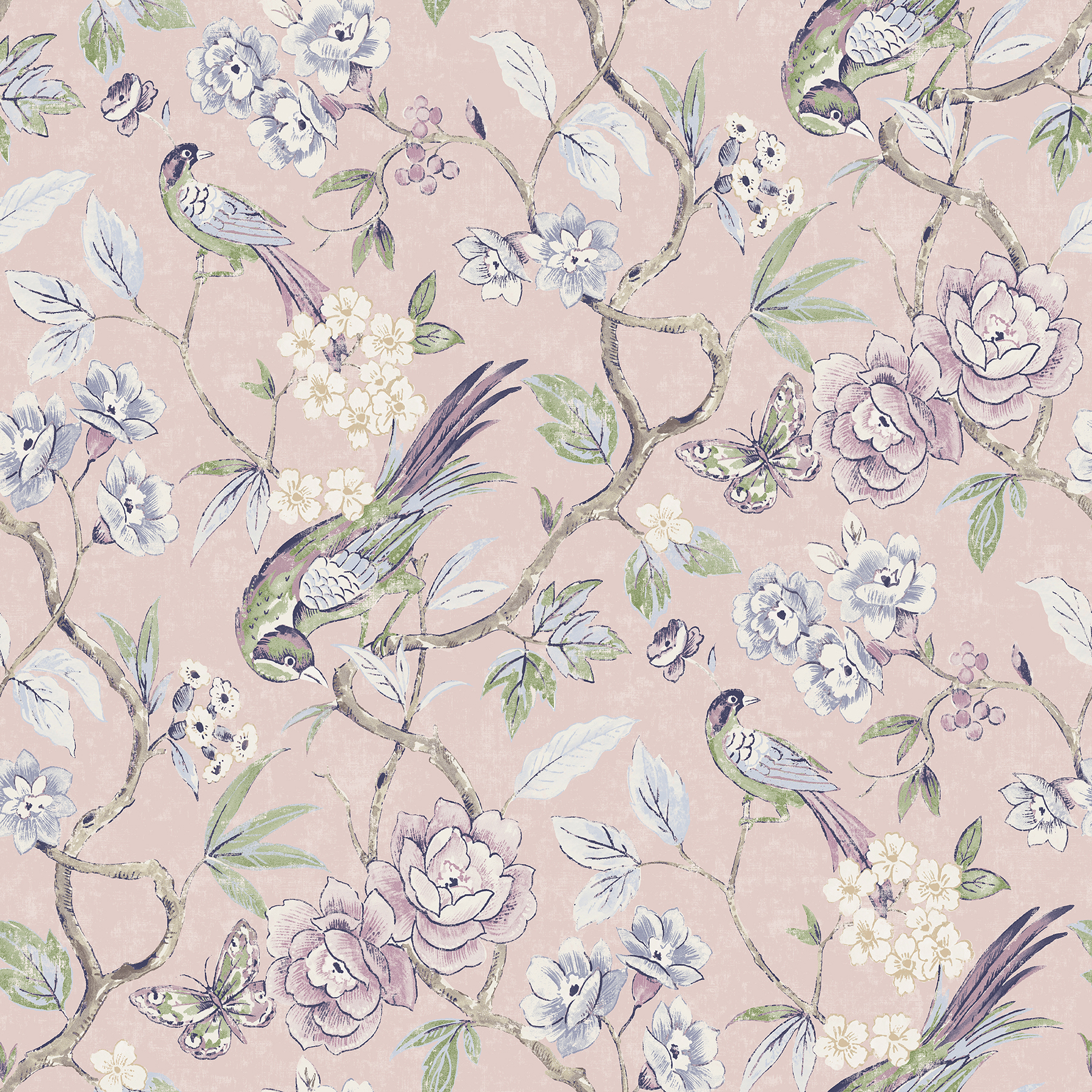 Bring timeless elegance to your space with this Waverly peel and stick wallpaper. Delicate birds perch among blooming florals in soft shades of lavender, blue, and cream, all set against a blush pink backdrop. The intricate design adds a romantic, chinoiserie charm to walls—perfect for bedrooms, powder rooms, and more. Aviary Garden Pink Peel and Stick Wallpaper comes on one roll that measures 20.5 inches wide by 18 feet long.