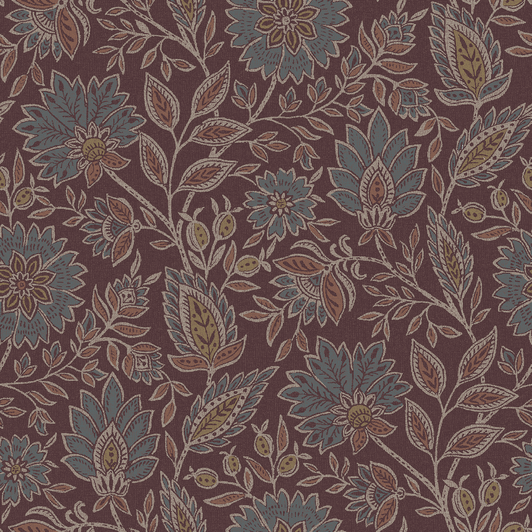 This peel and stick wallpaper pattern from Waverly features a richly detailed floral design with vintage appeal. Set against a deep burgundy background, the pattern showcases stylized flowers in muted teal, mustard, and rust tones, with fine ivory linework adding a hand-drawn, heritage-inspired feel. Indira Aster Maroon Peel and Stick Wallpaper comes on one roll that measures 20.5 inches wide by 18 feet long.