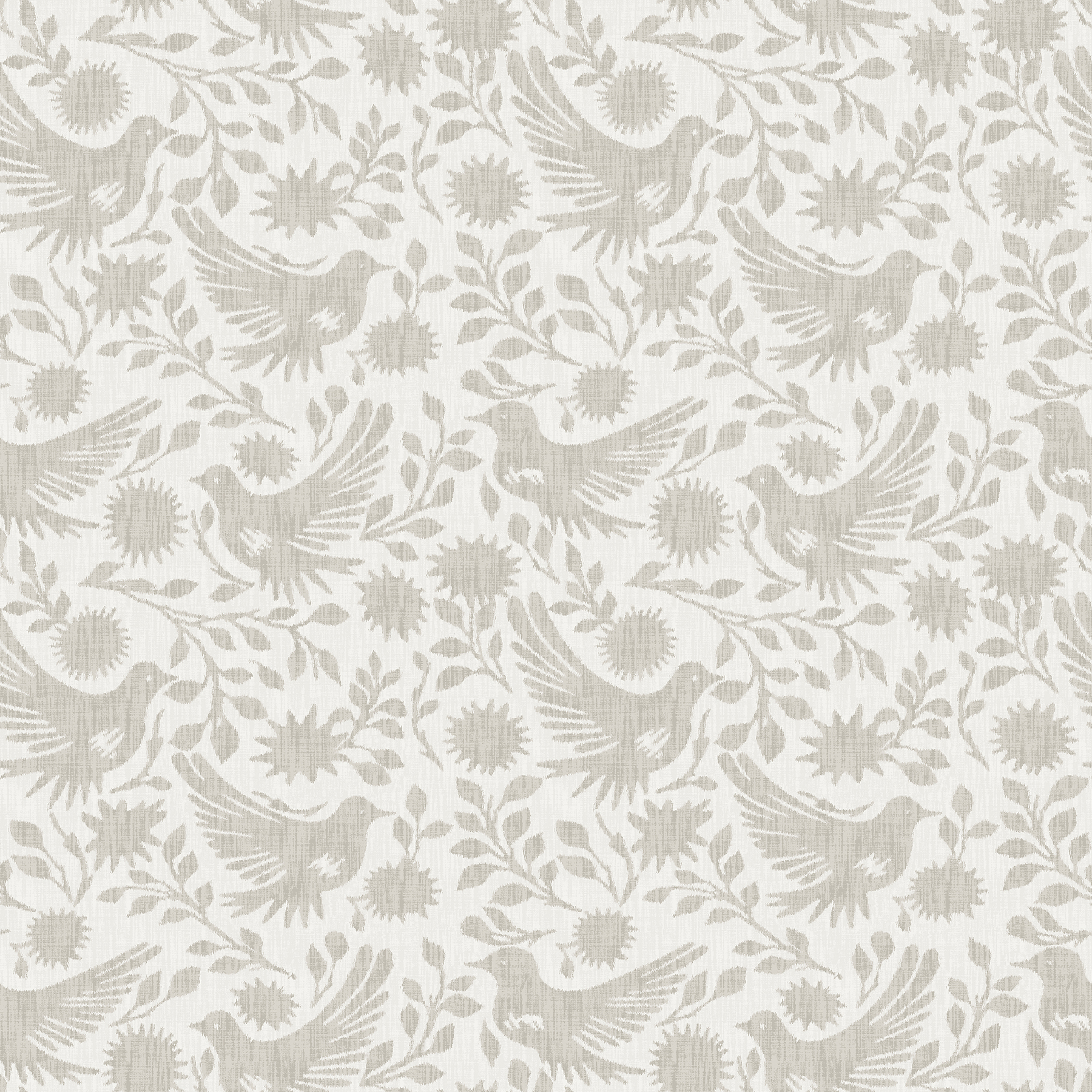 This peel and stick wallpaper pattern from Waverly features a soft and elegant folk-inspired design. Delicate birds, florals, and leafy vines are arranged in a charming, symmetrical pattern, rendered in a soft, neutral taupe over a crisp white backdrop. Ideal for adding a touch of quiet whimsy and transitional charm to nurseries, bedrooms, or reading nooks. Winged Serenade Taupe Peel and Stick Wallpaper comes on one roll that measures 20.5 inches wide by 18 feet long.